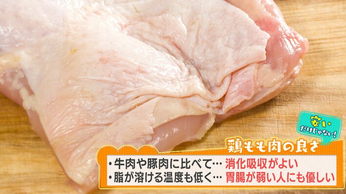 一つ目は切り方、そして焼き方がポイントになってきます。もも肉自体ってすごくお安いじゃないですか?でも肉としては豚肉とか牛肉のような赤肉じゃなくて白肉なので、消化にも優しくて油の溶ける温度も低いので胃腸の弱い方にも良いんですよね。