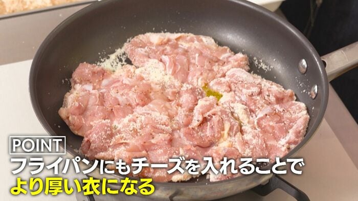 ⇒フライパンにもチーズをいれることによりより厚い衣になる
