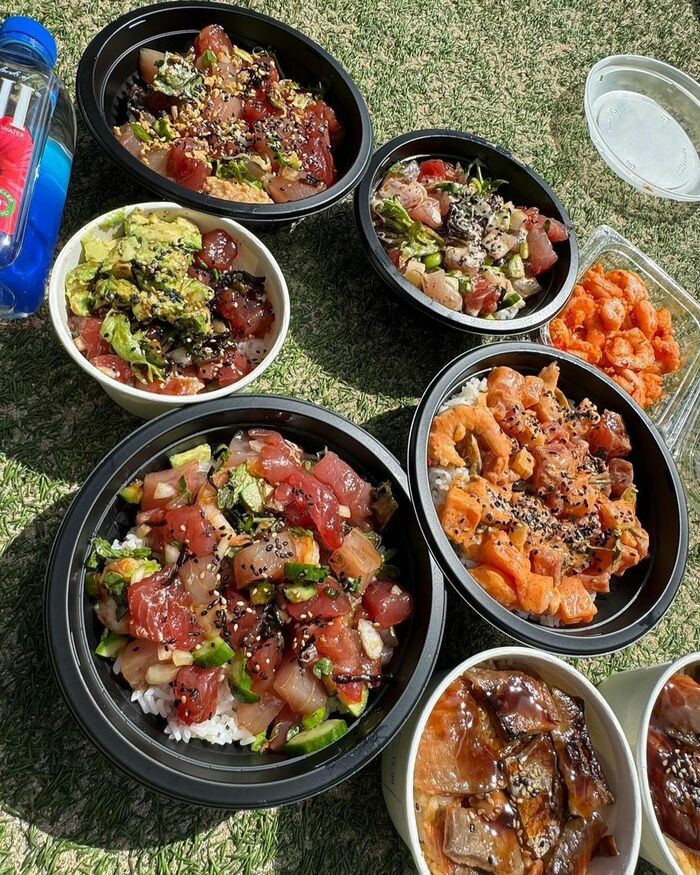 魚をしょうゆベースのタレで和え、白米に載せたハワイの伝統料理・ポキ丼をビーチで食べて楽しんだことを報告しています。