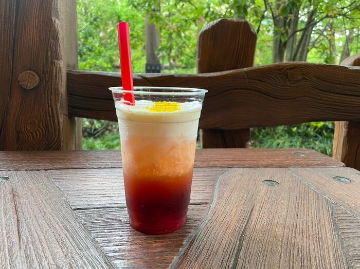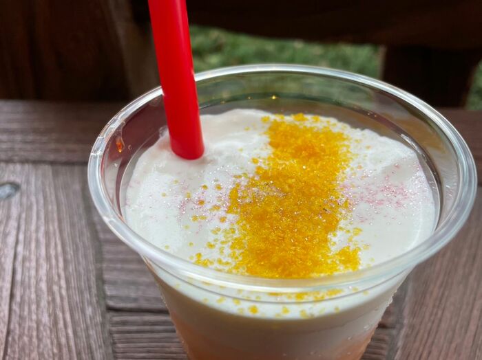 紅茶のシロップとホイップクリームのきれいな2層で、さらに、ラプンツェルの髪の毛をイメージした黄色いの砂糖をトッピング。