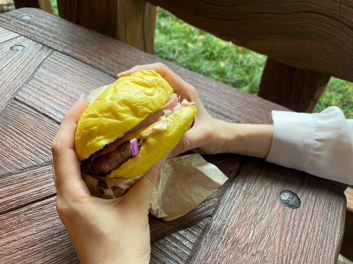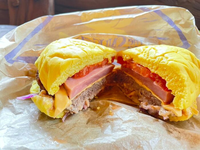 お店の看板のアヒルをイメージした黄色のバンズに、ビーフにベーコンを合わせたジューシーなパテと、ボロニアソーセージ、さらにチーズが挟まれた、荒くれ者たちが好みそうなワイルドなバーガーが登場。