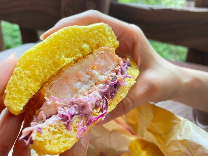 バンズからはみ出たエビと、ビーツを混ぜたピンク色のタルタルソースとの組み合わせは見た目のインパクト抜群!