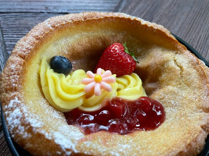 甘さ控えめでシュー生地さながら薄く焼き上げたダッチパンケーキのような生地に、ラプンツェルの髪の毛をイメージしたようなレモンクリームやフルーツトッピング。甘酸っぱさがおいしいスイーツは見た目も華やかで楽しめます。