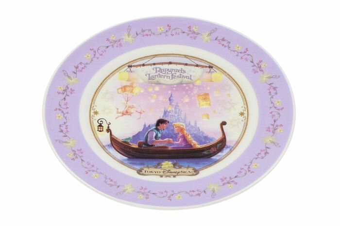 さらに、スーベニアプレートには、水面にうかぶボートに乗るラプンツェルたちの上にランタンが飛んでいる、幻想的なシーンが表現されています。