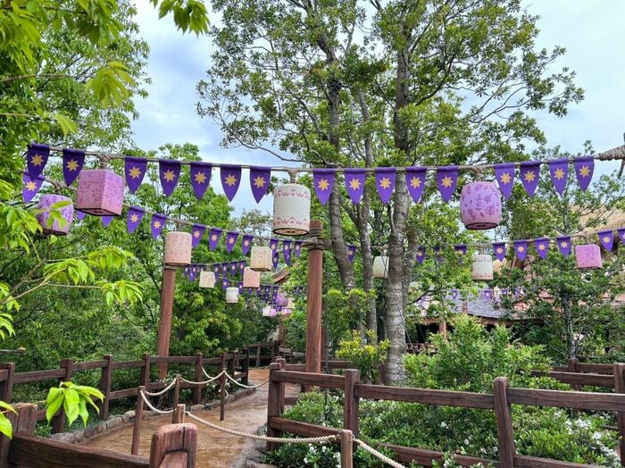 アトラクションの屋外の待機列には、ランタンや旗が飾られています。