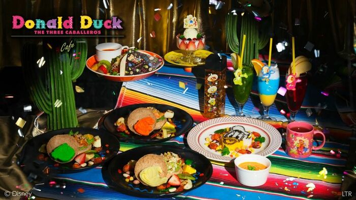 メニューは、ソンブレロを被ったドナルドダック、ホセ・キャリオカ、パンチートをイメージしたサンドイッチ、ドナルドダックの顔型ライスがインパクト大なカレー、メキシコをイメージしたタコスプレート、ドナルドダックのお誕生日をお祝いしたバースデーパフェの他、キャラクターをイメージしたドリンクなどカラフルで楽しいSNS映えするメニューが勢ぞろい。
