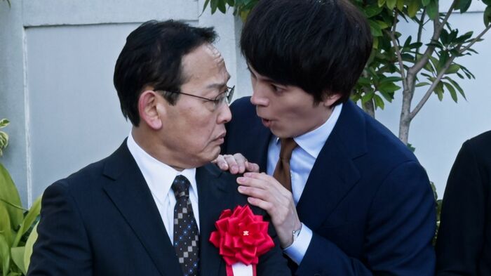暖をとりながら、⼝が回らなくならないように、始まる前から⼝を動かして準備をする林さん。監督の「よーい、スタート」の掛け声に合わせて、林さんが社⻑の⽿元で⼀気に捲し⽴てます。寒さをものともせず、早⼝をミスなく演じきる林さんの凄さに、スタッフも驚いていました。