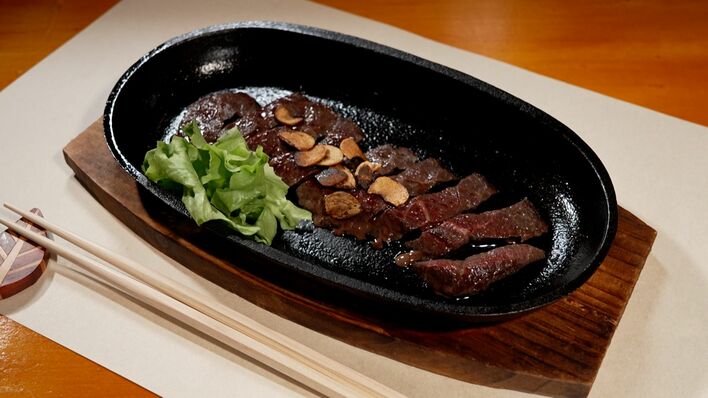 下関の給食では「竜田揚げ」が多いそうですが、家庭では焼くだけのステーキが主流とのことで、程よい弾力でクセがない赤身が特徴の「くじらステーキ」を提供してくれました。