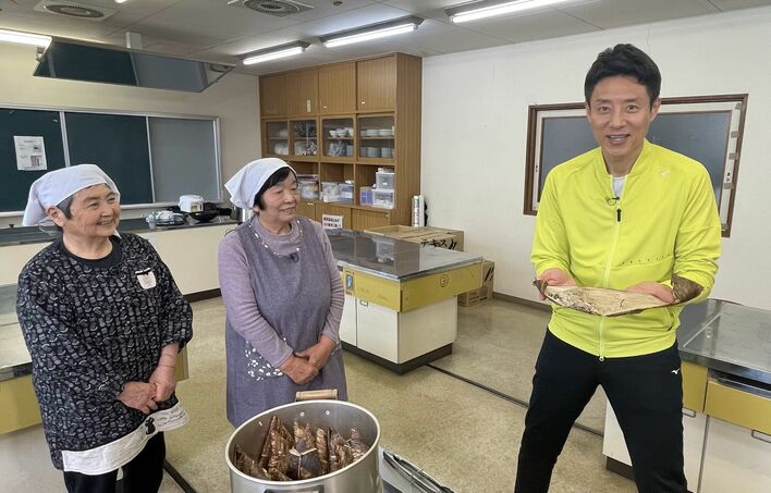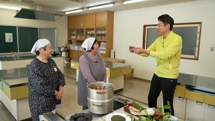 西日本有数の茶畑が広がる、山口県宇部市の小野地区を訪れた松岡さんは、「小野特産手づくりグループ」の金子小由紀さんと秋本喜代子さんに、この山口茶を使った料理を紹介してもらうことに。まずは特産の「山口茶」をいただき、「濃厚ですね!渋みみたいなものが甘みに変わっていく」とすっかり気に入った様子。