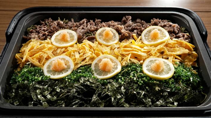 そばの上に「肉、ねぎ、のり、錦糸たまご」の4つのレーンができるようにイメージして肉を乗せると促され、驚きながらも松岡さんは手際よくトッピングを乗せ、最後にレモンの輪切りともみじおろしを乗せます。