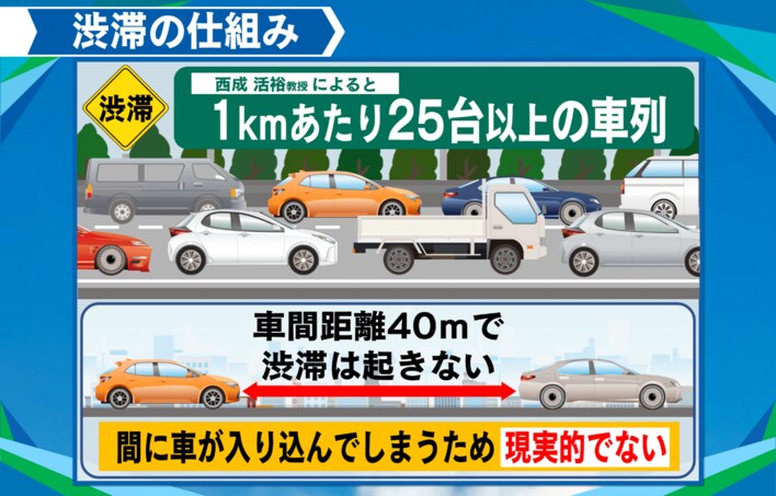 理論上、車間距離が40mあれば渋滞は起きないのですが、間にどうしても車が入り込んでしまうので、現実的ではありません。