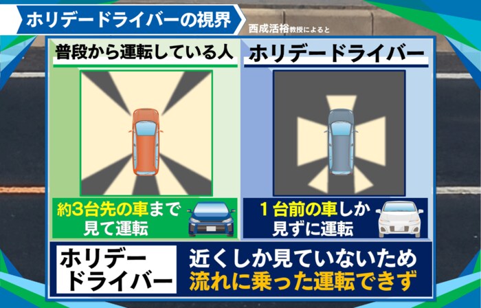 西成教授によると、普段から運転している人は、約3台先まで見て運転していますが、運転に慣れていないホリデードライバーは、1台前の車だけを見て運転しているので、流れに乗った運転ができなく渋滞を引き起こしてしまうそうです。