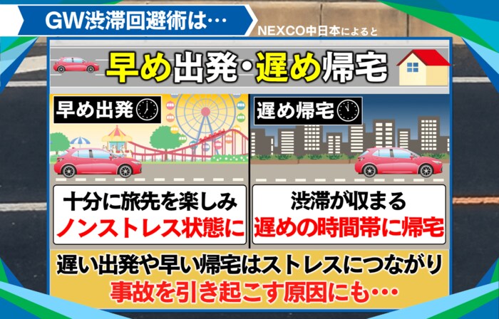 NEXCO中日本によると、回避術としては「早め出発、遅め帰宅」がポイントになるそうです。
