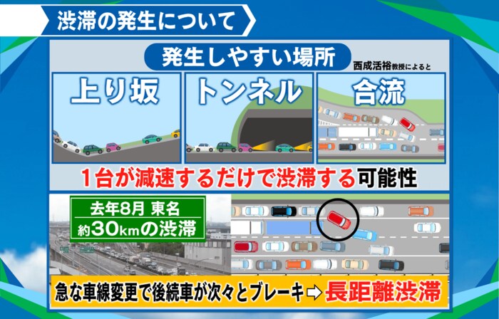 西成教授によると、渋滞が発生しやすい場所は、ブレーキが関係する上り坂、トンネル、合流です。