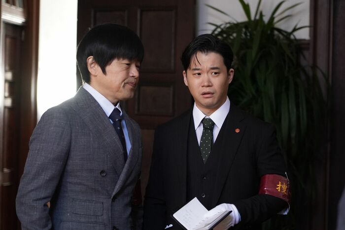 第一発見者は健一郎と第二秘書の村井浩平(渡辺佑太朗)。打ち合わせを終えて帰宅した健一郎たちは、書斎のドアに鍵がかかっていたことを不審に思い、庭に回り込んで室内を確認したところ田所が倒れていたという。