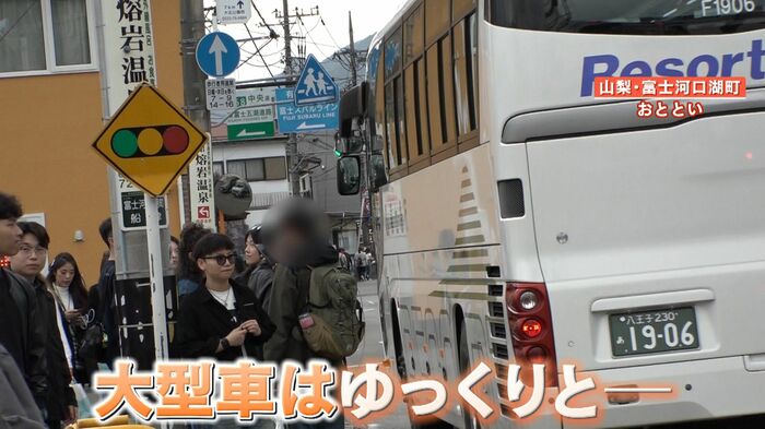 歩道いっぱいに観光客が連なり、車道にはみ出た歩行者にぶつからないよう大型車はゆっくりと走行します。