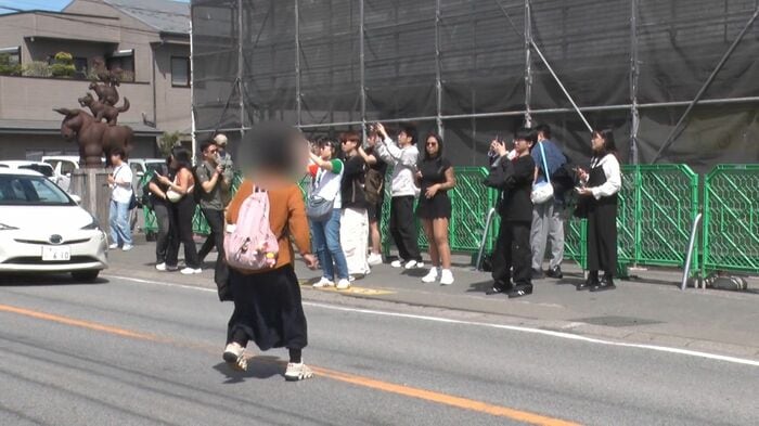 非常に多くの人がカメラを向けて撮影をしています。大きなキャリーケースがあり観光客ですかね、コンビニの敷地内でも写真を撮っています。