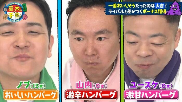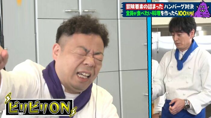 これにより、大吉さんが「一番おいしそうに食べていた人」に選ばれ(実際に食べたのは「激苦ハンバーグ」)、持ち手に電流が流れる食レポ妨害アイテム「ビリビリスプーン」をゲット!