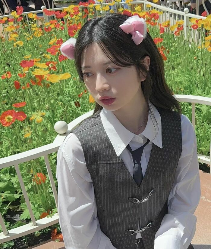 投稿された写真には、お花畑の前で白いブラウスにグレーのベスト、頭には猫耳のピンをつけた桜田さんの姿が。