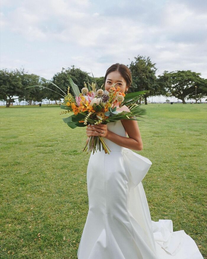 また、オレンジとピンクのリゾートブーケを持って少し顔を隠すショットも公開されています。