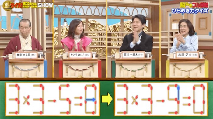 正解はまず、右の式の「8」から1本を動かし「0」にします。その1本を左の式の「5」に足して「9」にします。そうすれば「3×3-9=0」となります。かとうれいこさん、宮川一朗太さんの2人が正解でした。