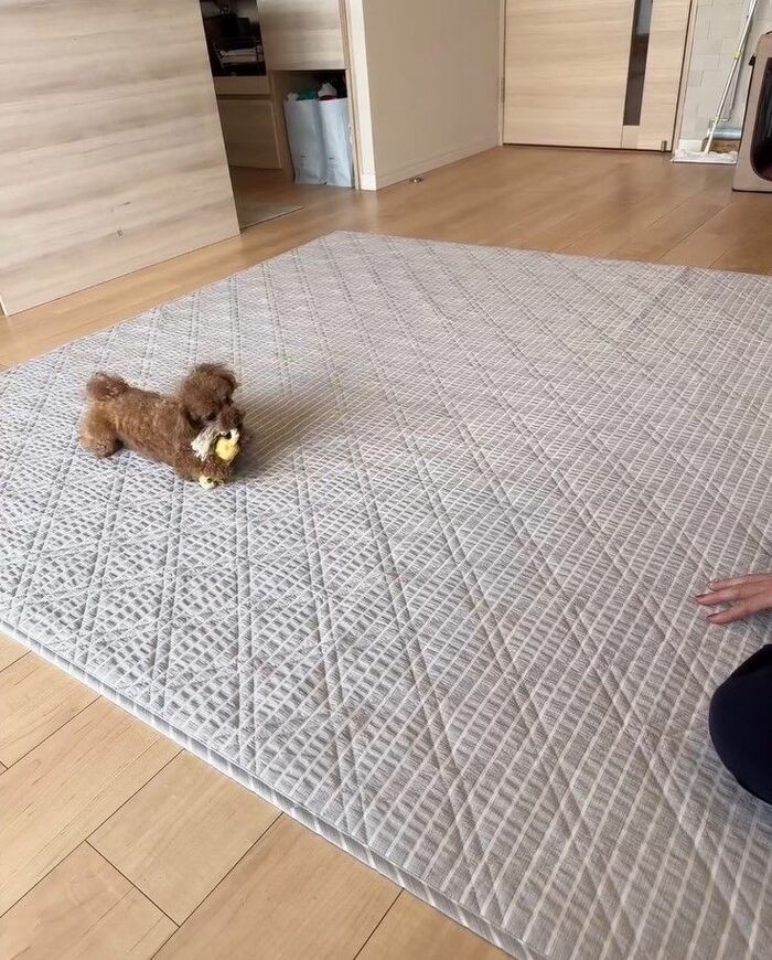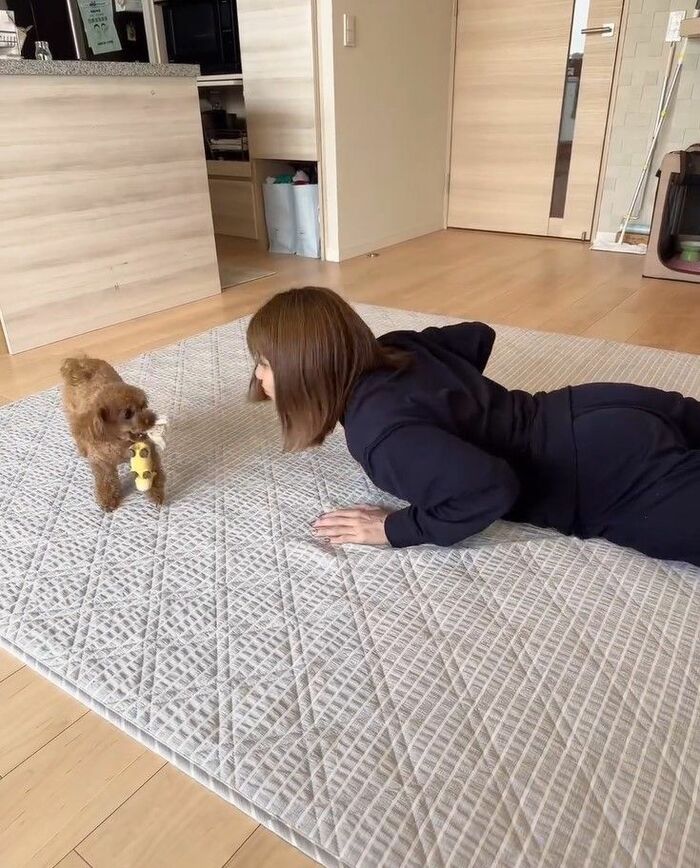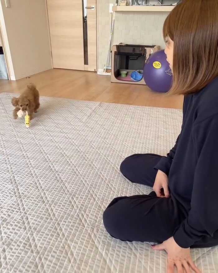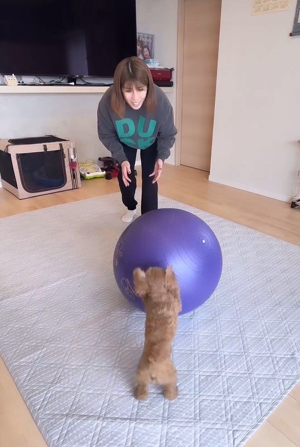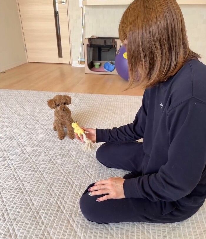 今回、投稿した動画には、「投げて持ってきて!の遊びをしたよ」というコメントとともに、トイプードルのリリーちゃんと音が鳴るおもちゃを使って遊ぶ吉田さんの姿が。