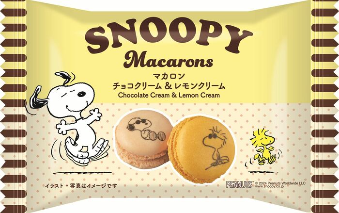 チョコ味とレモン味のクリームを使用したマカロン。マカロンにはスヌーピーとスヌーピーの1番の親友であるウッドストックがプリントされていて、パッケージも2種類あります!