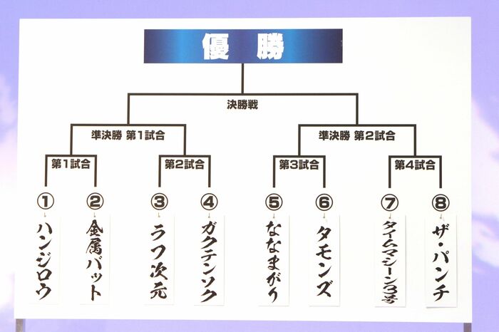 出場者は、クジを引きトーナメントの順番を抽選。第1試合は、ハンジロウVS金属バット、第2試合は、ラフ次元VSガクテンソク、第3試合は、ななまがりVSタモンズ、第4試合は、タイムマシーン3号VSザ・パンチに決定しました。