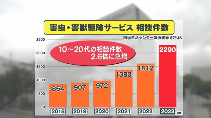 なかでも、害虫・害獣駆除サビースに関する相談件数が増えており、国民生活センターによると、相談件数は2023年度には2290件と、前年の1612件から約1.5倍に。年代別では10代から20代の若い世代の相談件数が2.6倍に増加しています。