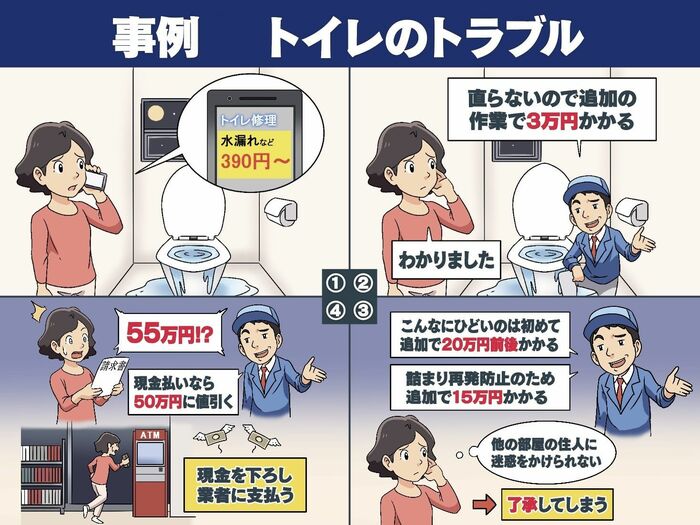 夜に自宅マンションのトイレが詰まってしまった相談者の女性は、インターネット広告に「料金390円から」と記載された事業者に修理をお願いしたいと電話。