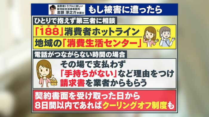 志部弁護士によると、「188(いやや)」の消費者ホットラインや、地域の消費生活センターに相談をする、電話がつながらない時間の場合は、その場で支払わず、「手持ちがない」など理由を付けて請求書を業者から受け取り、改めてつながる時間に連絡を行ってください。