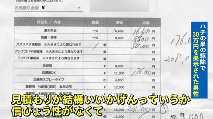 ハチの巣を取るのにそんなにお金がかかるのかって。見積もりが結構いい加減っていうか信ぴょう性がなくて、根拠とか説得力が全然そもそもあんまり感じられなかった。