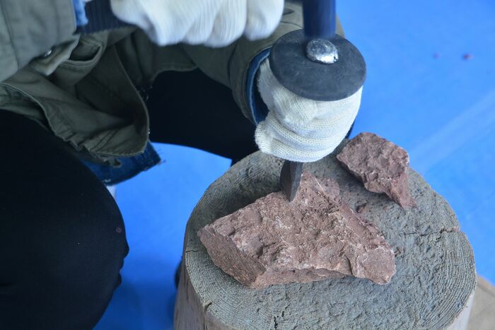 「まだ見ぬ化石が眠っているかもしれない」と研究員の方からの説明にドキドキしながら、ゴーグルと軍手、ハンマーとノミを受け取り、好みの石を選んだらいざ発掘スタート!