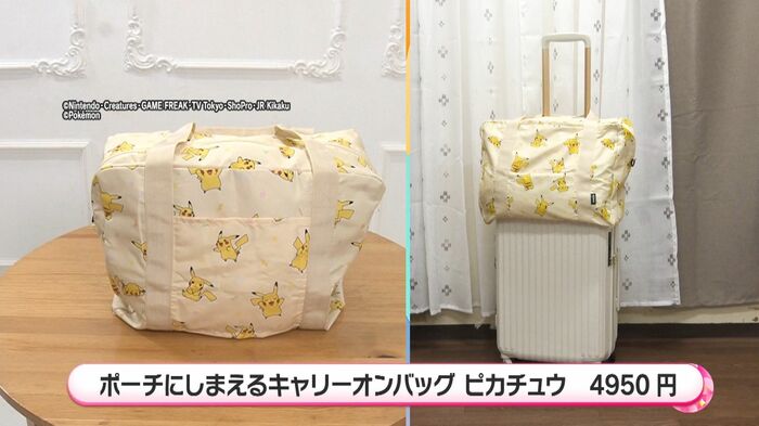 ピカチュウ柄の「キャリーオンバッグ」はスーツケースのバーに通すことが可能。増えてしまった荷物も楽に移動できます。