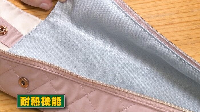 外はキルティングデザイン、内側は耐熱機能がある素材で、旅行先などでは使用後も熱いまま時間をおかずに、しまって持ち運べます。