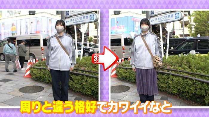 ジャージのトップスを着た女性は、デニムだけだと地味なところを、透け感のある紫色のスカートを着ることで、周りと差をつけられる着こなしに変身させていました。