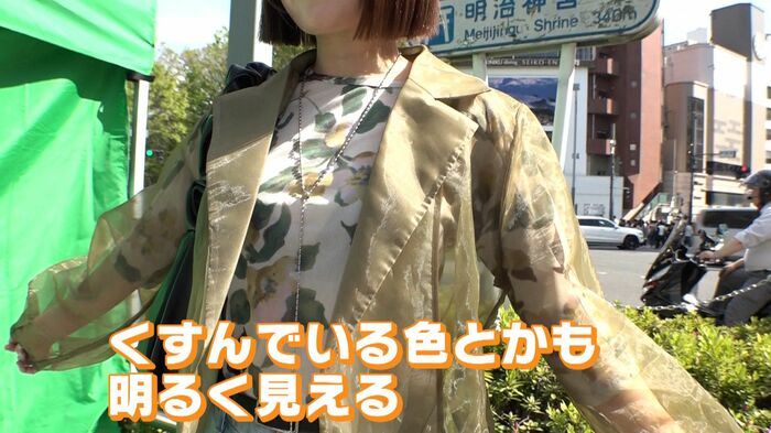 色は、くすんだ緑色のカラーをチョイス。「透けていることでくすんだ色も明るく見える」そうで、下に着ている花柄のトップスが透けて見え、マッチしていました。