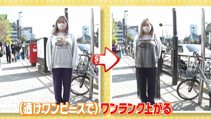 ともすると「ちょっと近くのスーパーに行くダル着」にも見えてしまうというベーシックな着こなしですが、透けワンピースをプラスで身につけることで「ワンランク上がる」コーデが完成するといいます。