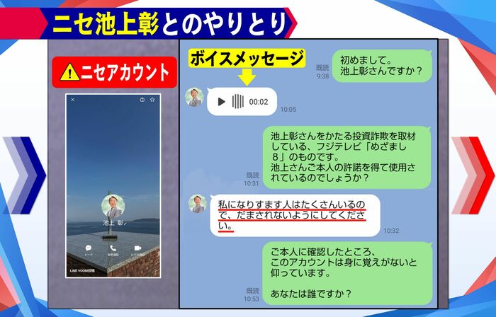 ―『めざまし8』で取材したところ、池上彰さんになりすましたアカウントから実際に音声メッセージが送られてきました。
