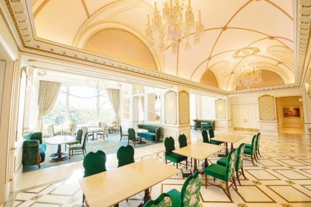 グランドシャトー宿泊ゲストだけが利用できる、クリスタルのシャンデリアが印象的な、気品漂う最高級のダイニングホール。レストラン内にはキャラクターグリーティングができる専用の部屋もあり、特別なひとときが過ごせます。