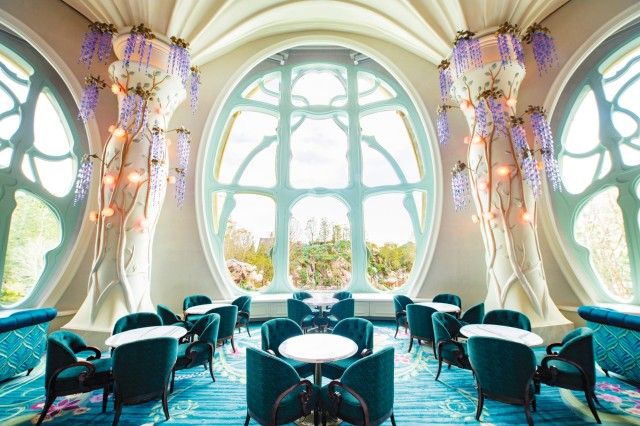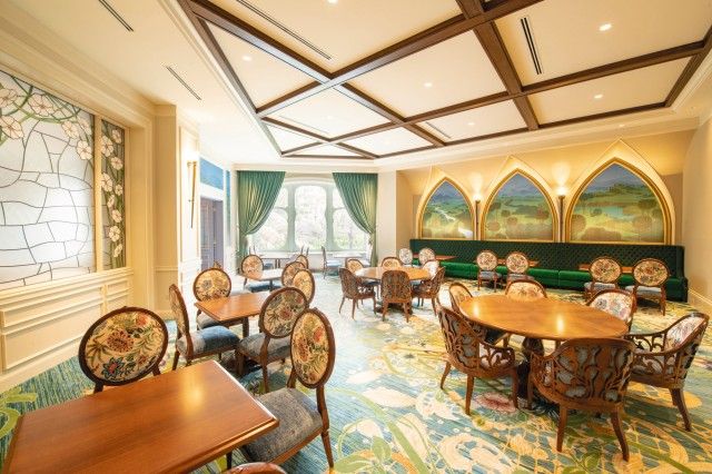 ブレックファスト、ランチ、ディナーのいずれもブッフェスタイルで提供するレストラン。店内はディズニー映画「塔の上のラプンツェル」や「白雪姫」、「眠れる森の美女」をモチーフにした、青い鳥や様々な森の動物が描かれた絵画が飾られています。