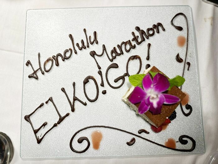 そこには、デザートがのったプレートに「Honolulu Marathon EIKO!GO!」とチョコレートで書かれています。