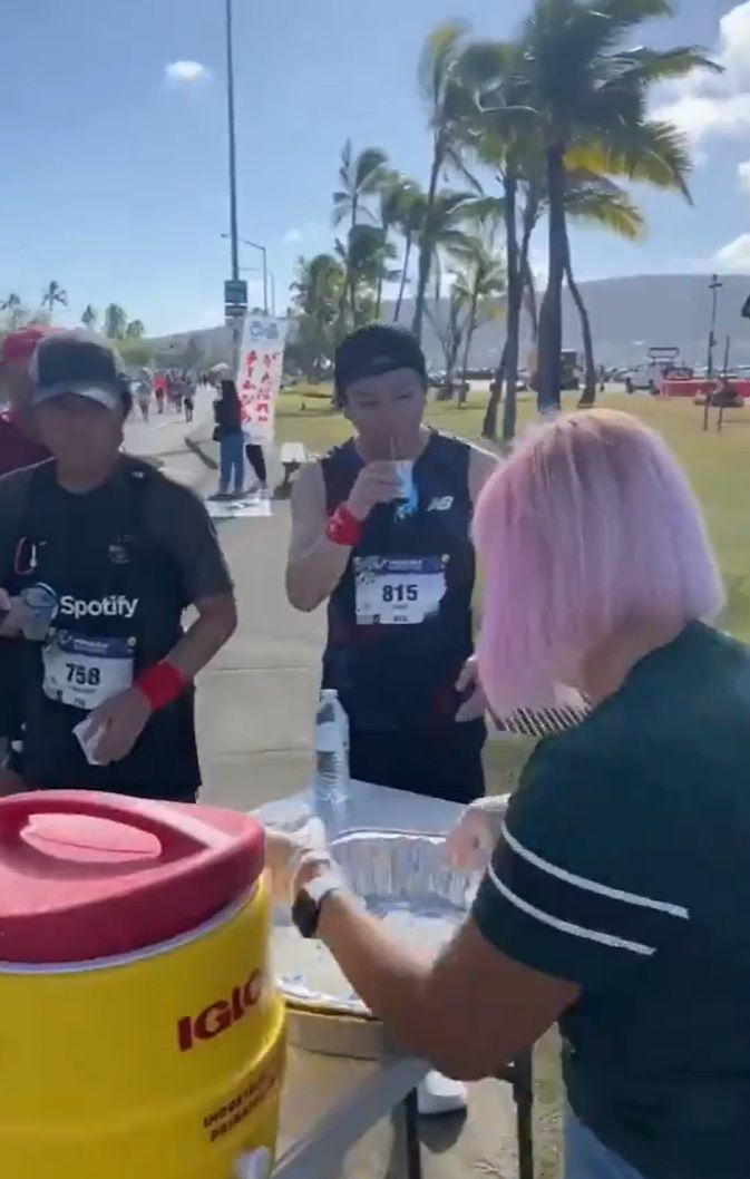 「沿道に出てた、ボランティアの方々のおもてなし、一口ソーメンが体と心に沁みた」といい、そうめんをすする様子が。