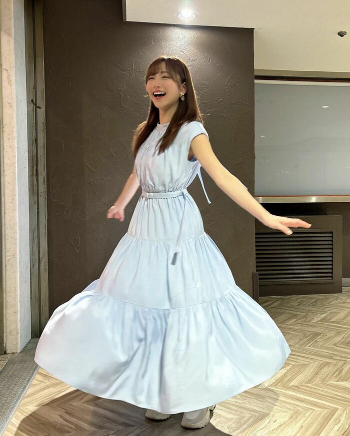 さらに、青山さんは「このワンピースとっても軽くて、回るとふんわり広がって可愛いの〜」という紹介とともに、ワンピースの全身ショットも公開。くるりと周りふんわりと広がった春らしいパステルブルーのコーデに「お姫様みたいで素敵」「爽やかでかわいい」と絶賛の声があがっています。