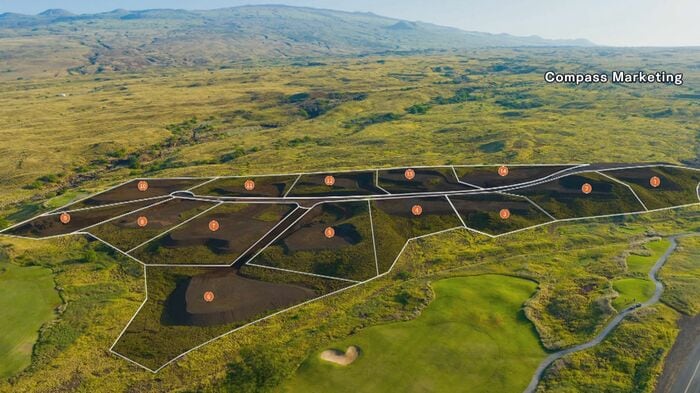 こちらハワイ島の西海岸マウナケアリゾートという高級エリアに新しく造成されている別荘地です。目の前には真っ青な海が広がっています。ゴルフコースも見えますね。