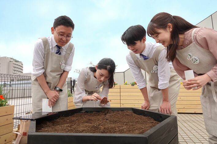 2024年にフジテレビに入社した新人アナウンサー4人が、フジテレビ本社の敷地内にオープンしたばかりの「アクションお台場ファーム」で野菜の種まきをしました。
