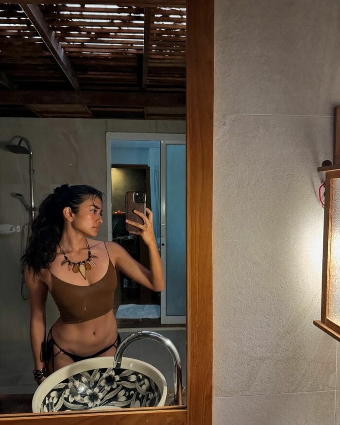 タイの自然とマッチしたカラーのビキニ姿で鍛え上げられた腹筋を披露しています。