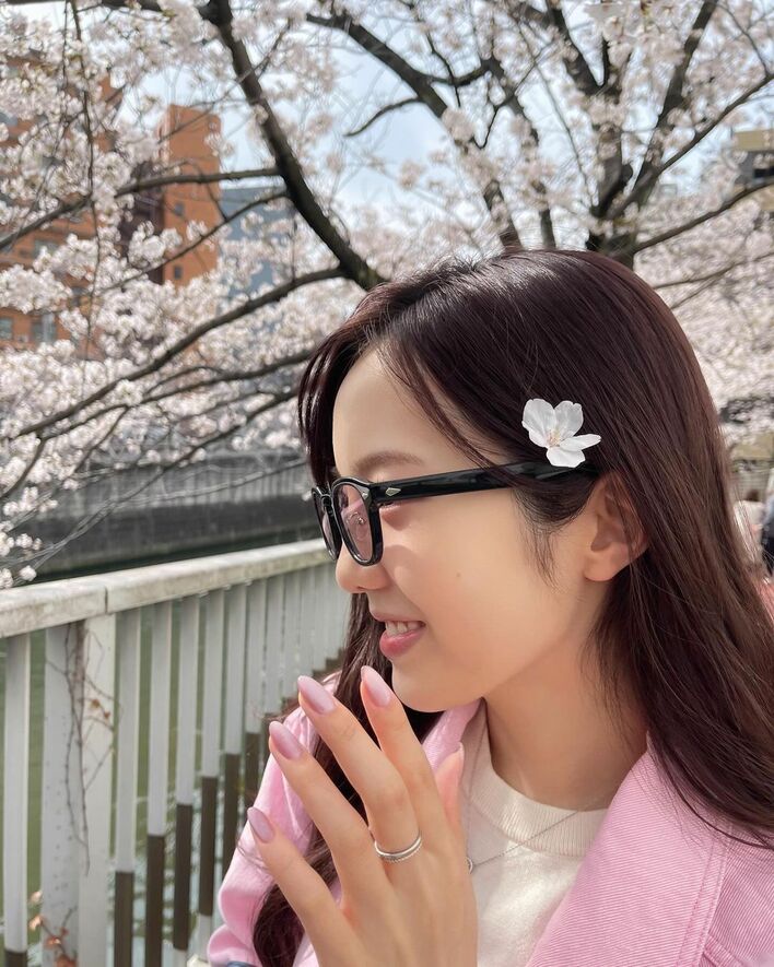 髪に桜の花をつけた写真も。よーく見ると服だけでなく、ネイルもピンク色にしていました。