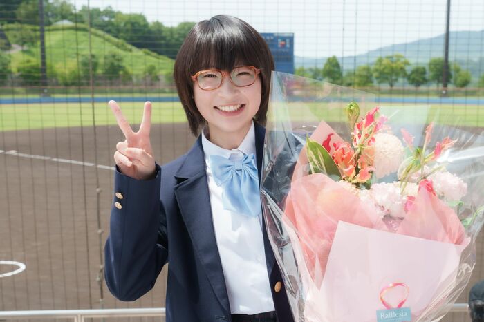 そんな梶間を演じた石川瑠華さんは、平原さん、阿久津さんから数日遅れてのクランクアップ。こちらも野球場での撮でしたたが、この日は、第8話の、梶間がスコアブックの師匠となる、芋川(岡田圭右)と初めて出会うシーンだったこともあり、制服姿でのクランクアップとなりました。