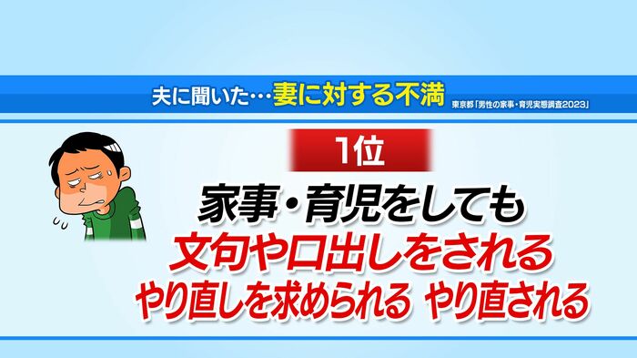 夫が妻に対して抱く不満の1位は、「家事や育児をやっても文句を言われたり、やり直しを求められたりする」でした。